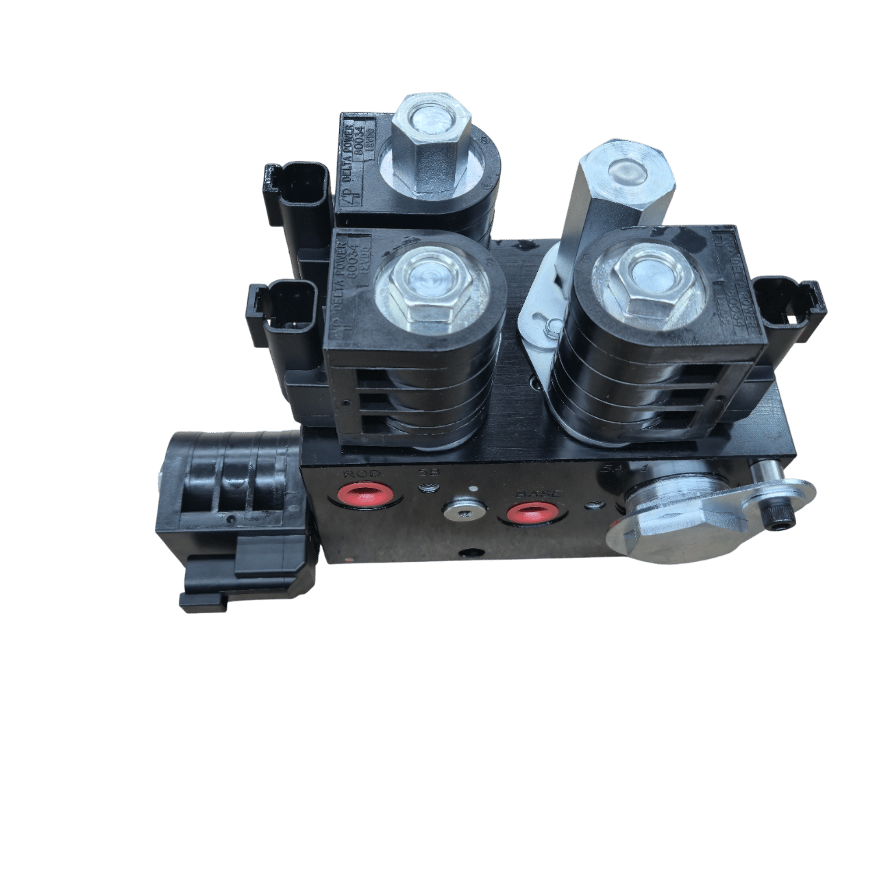 Hydraulic valve assembly that controls bale density pressure in the bale chamber. Essential component for maintaining consistent bale density and quality.