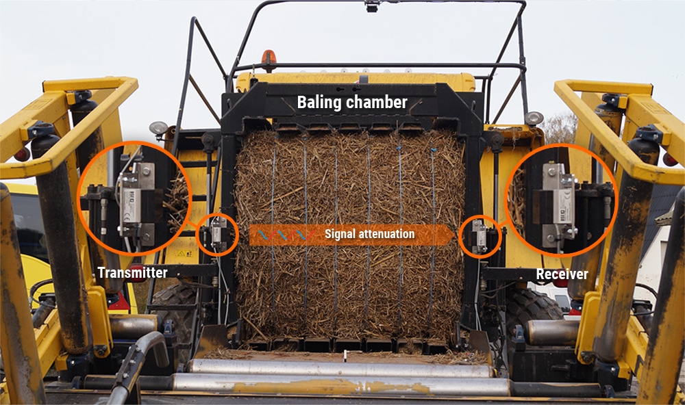 How It Works: The transmitter sends microwave signals through the bale while the receiver measures signal attenuation caused by water molecules in the material. This data is instantly converted to moisture percentage and displayed in the tractor cabin. The system measures up to 13,000 cm³ of material with each pressure stroke, calculating average moisture content across the entire bale cross-section.